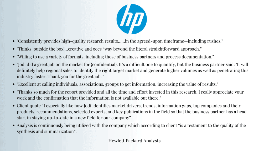 Jodi was able to listen closely to me, distill down exactly what I needed for the project, then send me the most relevant information—all within a great turnaround and at a price within my budget. The result is: My client was super-impressed with this research, which made me look good! Her firm is going to be my only source for the hard-to-find research when I need it. I could not ask for anything more.